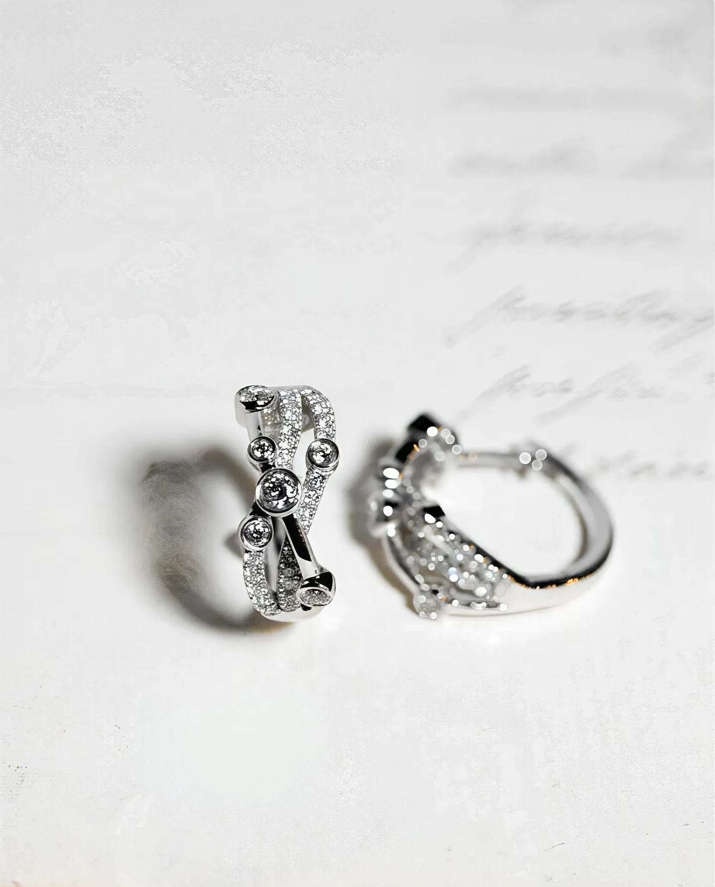 繊細なラインにダイヤが流れるようにセッティングされ、凛とした気品とモダンな遊び心が同居するデザイン。